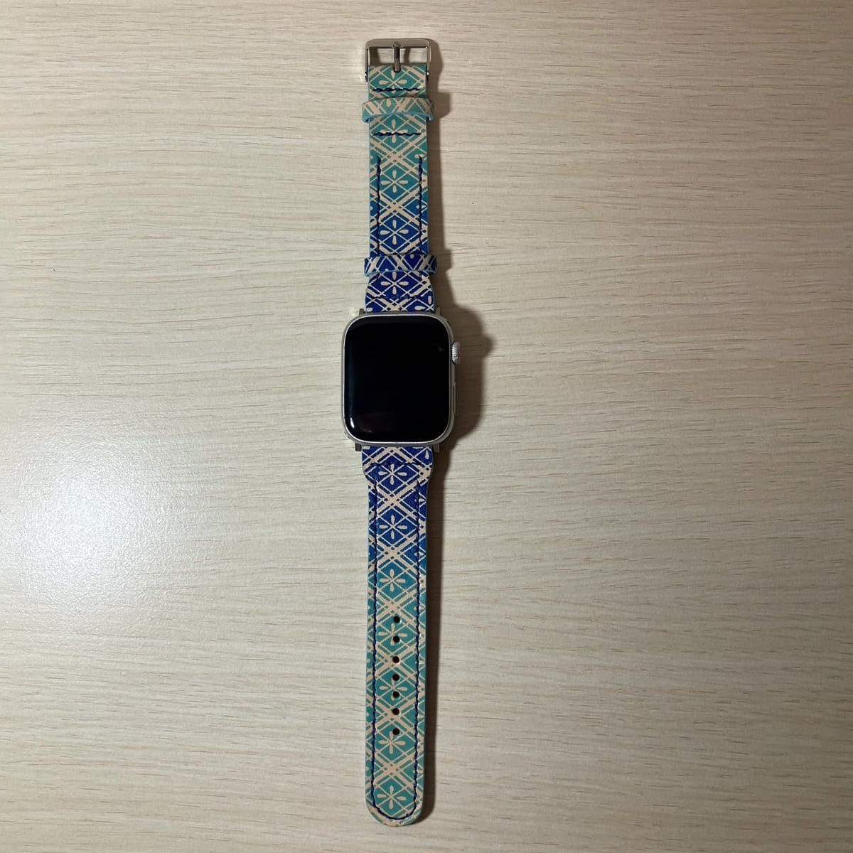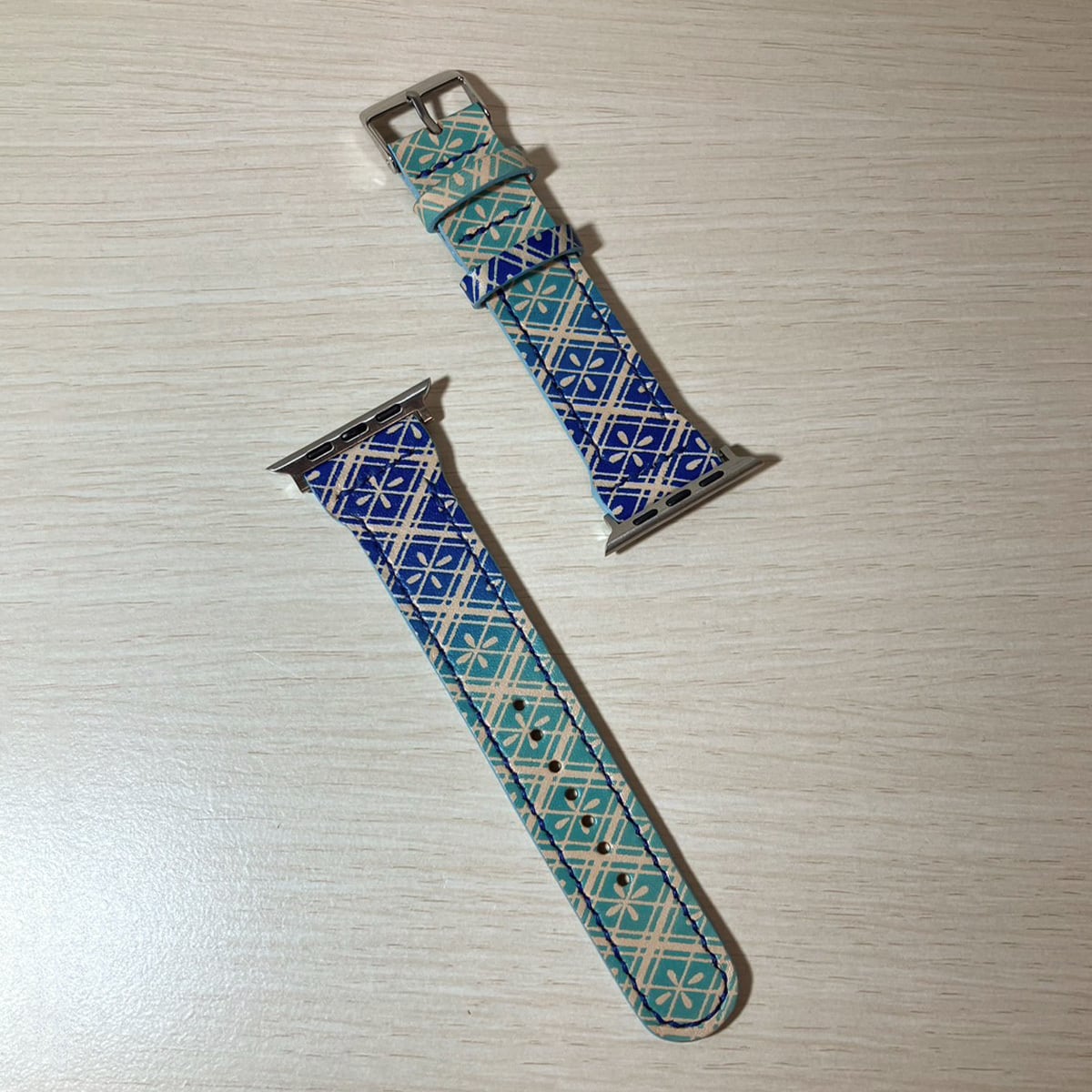 着物染色技法の型染めぼかしの技法で菱柄で染めた革で作ったアップルウォッチバンドです。